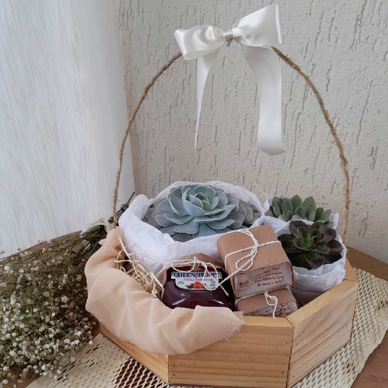 Acompanha: 2 saquinhos de torrada, geleia de frutas vermelhas, 1 suculenta grande, 2 suculentas média.
